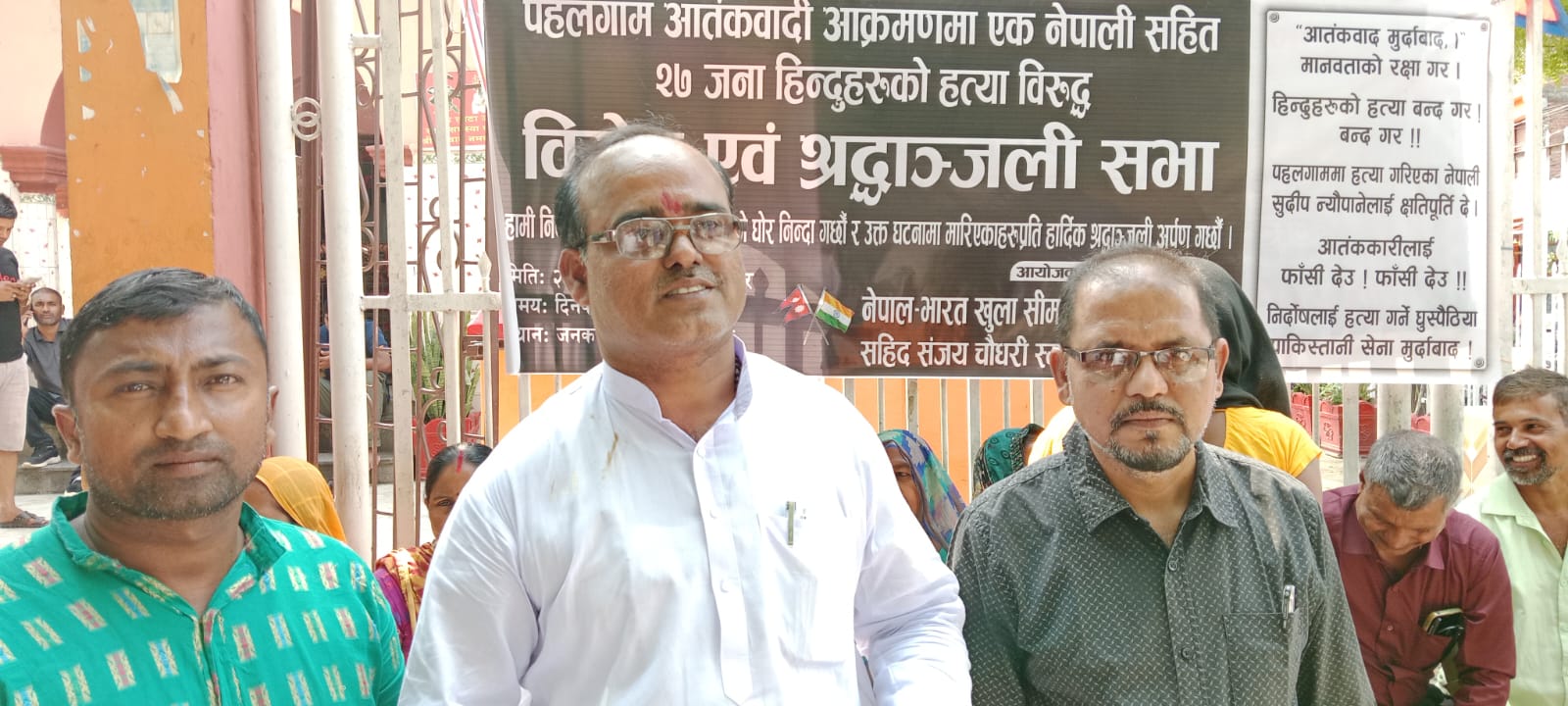 जनकपुरधाम, २०७५ बैशाख १७ – नेपाल भारत खुला सिमा संवाद समूहको आयोजनामा आज जनकचोकमा विगत केही दिन अघि पहलगाम, भारतमा एक नेपाली नागरिक सुदीप न्यौपानेसहित २७ जनाको आतंककारी हमलामा ज्यान गएपछि त्यसको विरोधमा हजारौंको संख्यामा नागरिक सहभागी भई आक्रोशपूर्ण विरोध कार्यक्रम सम्पन्न गरिएको छ।