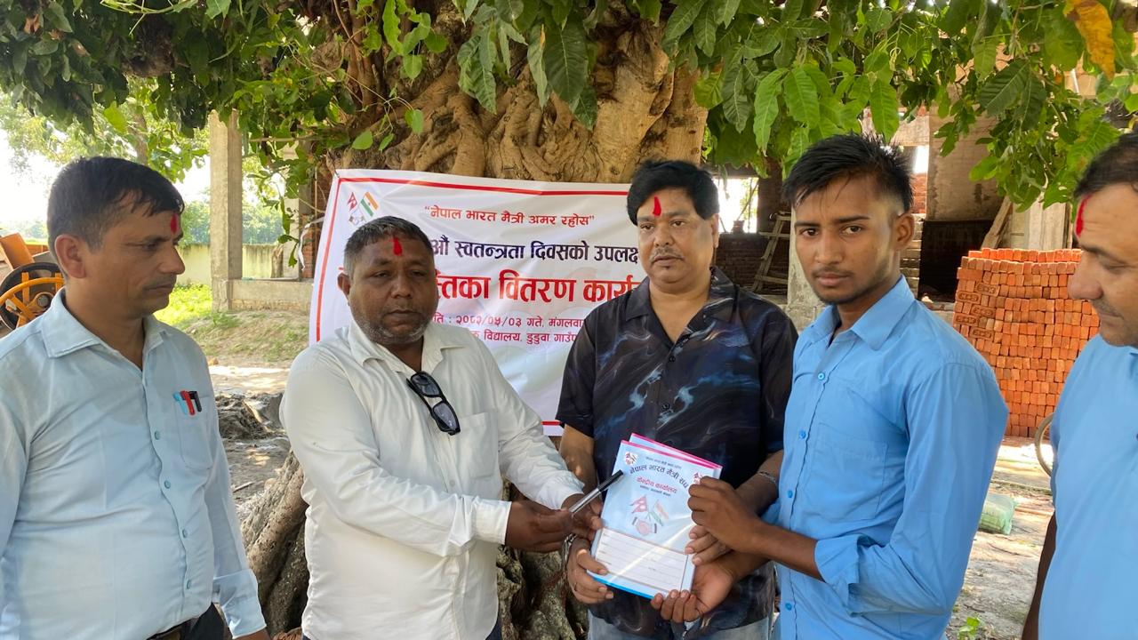 नेपाल भारत मैत्री संघ केन्द्रिय समितिको सहयोगमा नेपाल भारत मैत्री संघ बाँके शाखाले मंगलबार बाँकेको एक विद्यालयका विद्यार्थीहरुलाई शैक्षिक सामाग्री वितरण गरेको छ । बाँकेको डुडुवा गाउँपालिका वडा नं.६ मा रहेको सरस्वती माध्यामिक विद्यालय भघोटनाका विद्यार्थीहरुलाई हस्त लेखन(ठुलो कपी र जेल पेन)वितरण गरेको छ । कार्यक्रममा छिमेकी देश भारतको ७९ औ स्व्तन्त्रता दिवसको अवसरमा आयोजना गरीएको सो कार्यक्रमको अध्यक्षता नेपाल भारत मैत्री संघ बाँकेका अध्यक्ष एवं केन्द्रिय सदस्य प्रदीप कुमार गुप्ताले गरेको थिए । शिक्षा समिति संयोजक बृजेश बहादुर सिंहको संयोजकत्वमा भएको उक्त कार्यक्रममा सचिव श्याम केसी,कोषाध्यक्ष तुषार शाह,सदस्यहरु रामलखन वैश्य,अजय केसी ,सुरेन्द्र बर्नवाल गुप्ता,तोजेन्द्र विक एवं विद्यालय व्यवस्थापन समिति अध्यक्ष धनीराम याद,प्राध्यापक ज्वाला रेग्मी लगायतको उपस्थिति रहेको थियो भने कार्यक्रमको सहजीकरण शिक्षक सुरेन्द्र साउदले गरेको थिए ।