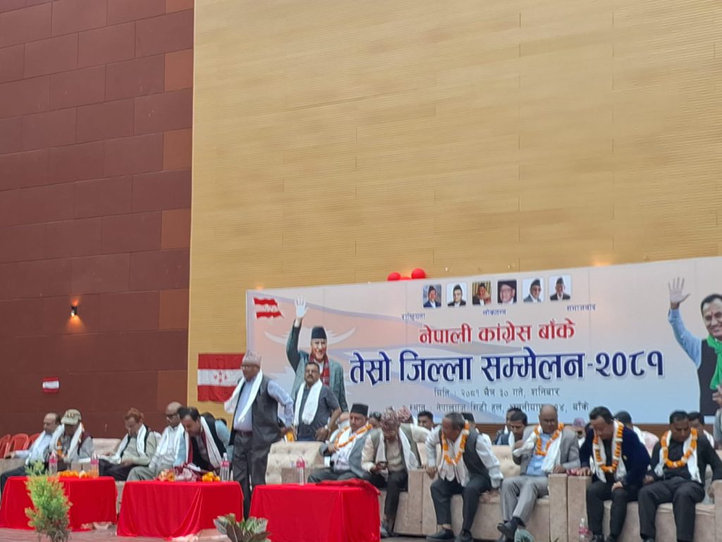 नविन कांग्रेस बनाउने अठोटका साथ नेपाली कांग्रेस बाँकेको तेस्रो जिल्ला सम्मेलन शनिबार सम्पन्न भएको छ ।पार्टि सभापति नारायण प्रसाद गौडेलको सभापतित्वमा सम्पन्न कार्यक्रमको प्रमुख अतिथिमा नेपाली कांग्रेसका महामन्त्री विश्वप्रकाश शर्मा रहेका थिए । महामन्त्री शर्माले नेपाली कांग्रेसले भावना पुरानो र नविन संभावना बोकेको कांग्रेसको रुपमा अगाडि लैजाने बताए । पछिल्लो समय नेपाली नागरीकमा नैरासियता भन्दा पनि असन्तुष्ट बढ्दै गएको अवस्थामा ने्पाली कांग्रेसले आफ्ना विचारहरुलाई नागरीकको समस्या समाधान गर्ने गरी लैजानका लागि कार्यक्रम बनाएर अगाडि बढ्ने बताए ।नेपाली कांग्रेस पुरानो दलको रुपमा रहेको हुदाँ नयाँ घर बनाए जस्तो सहज र सरल नभएको बताउँदै पुरानो घरलाई व्यवस्थित बनाउने हो त्यसका लागि नयाँ ढंगले काम गर्दै आएका बताएका थिए । त्यसै गरी नेपाली कांग्रेसका सहमाहामन्त्री तथा कार्याक्रमका विशिष्ट अतिथि किशोर सिंह राठौरले बांँके कांग्रेसको तेस्रो जिल्ला सम्मेलनलाई सम्बोधन गर्ने क्रममा जिल्ला सम्मेलनलाई उत्सवको रुपमा लिनु पर्ने बताए । सहमहामन्त्री तथा कांग्रेसी नेता राठौरले नेपाली कांग्रेसमा एकले अर्काेलाई रिस गर्ने प्रवृति रहेको हुदाँ लोकतान्त्रिक अभ्यासमा आउन सबैलाई अनुरोध गरेका थिए । लोकतान्त्रिक प्रवृति भएका मात्रै कांग्रेसी हुन सक्ने धारणा राख्दै नेता राठौरले सबैलाई प्रतिस्पर्धामा आउन र लोकतान्त्रिक प्रणालीमा विश्वास गर्ने सबैलाई आग्रह समेत गरेका थिए ।नेपाली काग्रेस बाँकेका पार्टि सभापति नारायण प्रसाद गौडेलको सभापतित्वमा भएको जिल्ला सम्मेलनमा पार्टि सभापति गौडेलले नेपाली कांग्रेस जिल्लाको निति तथा कार्यक्रमका बारेमा आफ्नो प्रस्तुतिकरण राखेको थिए । सोही क्रममा पार्टि सभापति गौडेलले जिल्लामा निर्माणाधिन सुशील कोइराला स्मृति भवन सम्पन्न गर्ने ,दिवसीय कार्यक्रम ,सम्मेलन एवं सामाजिक तथा विकास निर्माणका कार्यक्रमका बारेमा बताए थिए । यसैगरी कार्यक्रममा कांग्रेस बाँकेका सचिव सुधान्सु कोइरालाले सम्मेलनमा पार्टिको सांगठनिक प्रतिवेदन प्रस्तुत गरेका थिए । आफ्नो सांगठनिक प्रतिवेदन प्रस्तुत गर्ने क्रममा सचिव कोइरालाले नयाँ पुस्ताका लागि खुला र प्रेरणादायी पाठशालाको रुपमा रहेको कांग्रेस पार्टि वर्तमान अभिभारा र दायित्वहरुको सम्पादनका खातिर सदाझै अहिले नि अग्रमोर्चा मै रहेको बताएका थिए ।यसैगरी सम्मेलनमा आर्थिक प्रतिवेदनका बारेमा जिल्लाका कोषाध्यक्ष यज्ञ बहादुर बस्नेतले आफ्रनो प्रस्तुतीकरण राखेका थिए ।सम्मेलनको उद्घाटन सत्रमा केन्द्रिय सदस्य दिपक राज गिरी,सन्जय गौतम,डा.गोपाल दहित,मैकुलाल वाल्मीकी,लुम्बिन
