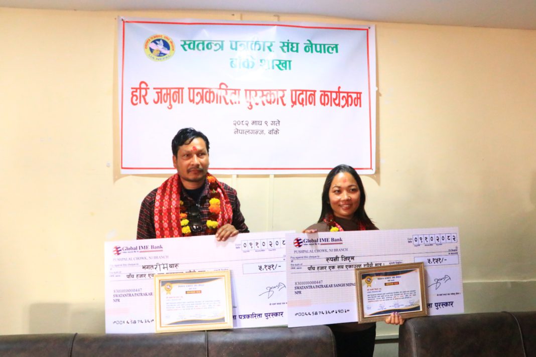 स्वतन्त्र पत्रकार संघ नेपाल बाँके शाखाले प्रदान गर्ने हरि जमुना पत्रकारीता पुरस्कार पत्रकार भगत राम थारु र पत्रकार रुपनी जिएमलाइ प्रदान गरिएको छ । शिक्षक तथा समाजसेवी माधबी शाहले स्वतन्त्र पत्रकार संघ नेपाल बाँके शाखा मार्फत आफ्नो स्वर्गीय माता पिताको नामबाट स्थापना गरेको हरी जमुना स्मृती अक्षय कोष मार्फत उक्त पुरस्कार प्रदान गरिएको हो ।