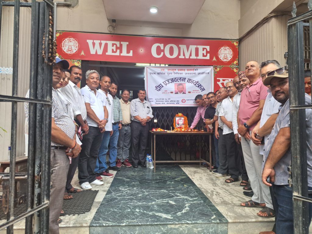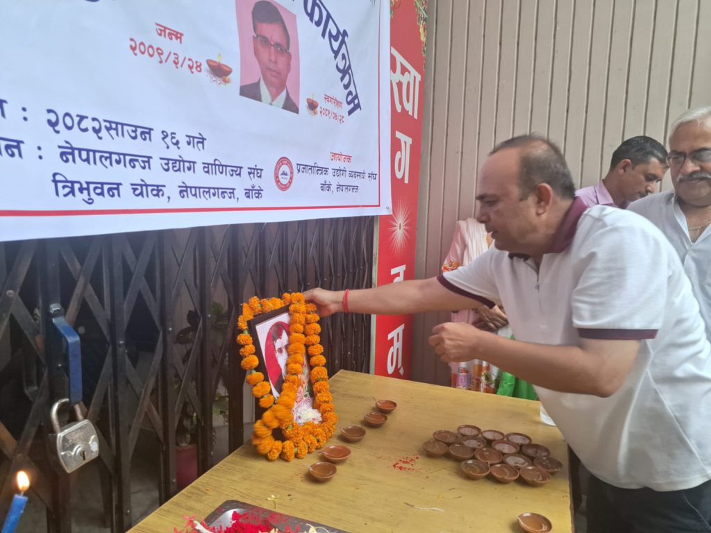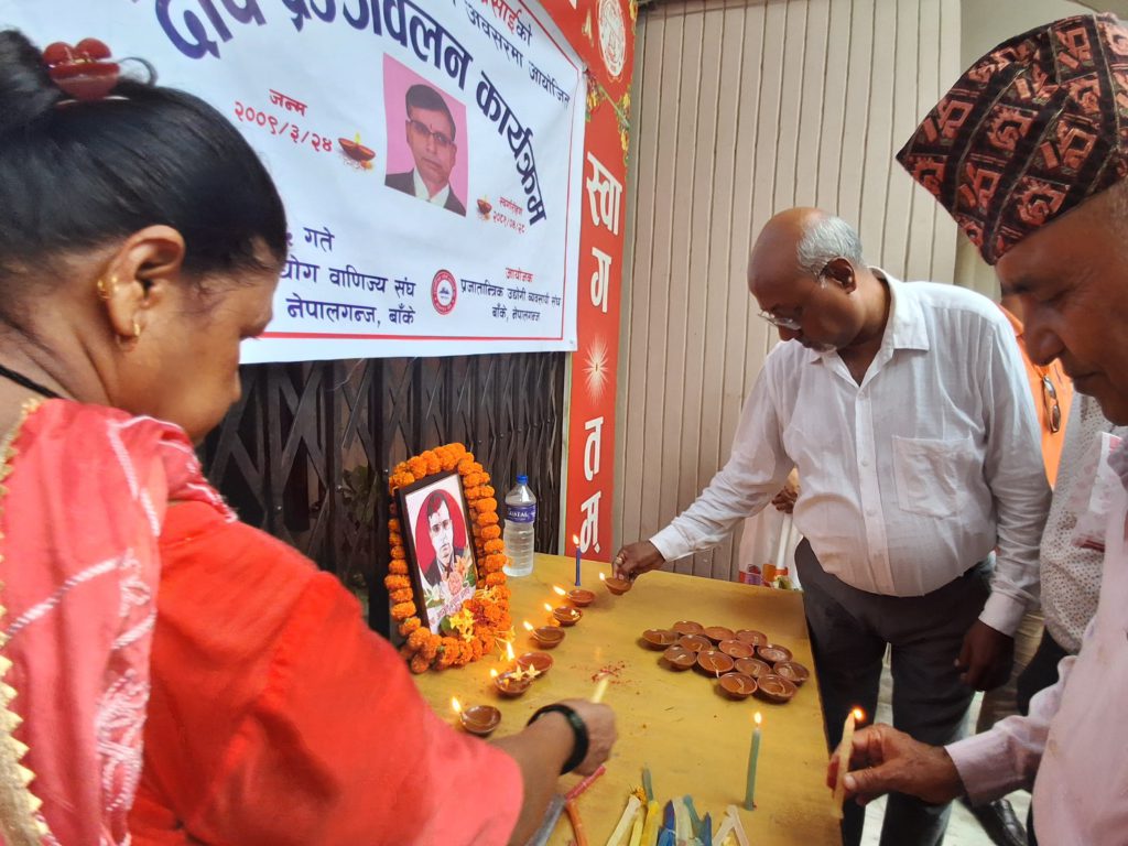 प्रजातान्त्रिक उद्योगि व्यवसायी संघ बाकेले स्वर्गीय अचुत प्रसाद प्रसाईंलाई शुक्रबार दिप प्रज्वलन गरि सम्झिएको हो। उद्योग वाणिाज्य संघ नेपालगन्जका पुर्व अध्यक्ष तथा पुर्व केन्द्रीय सदस्य समेत रहि सकेका स्वर्गीय प्रसाईको वार्षिक पुन्यतिथिको अवसरमा सम्झिएको हो ।