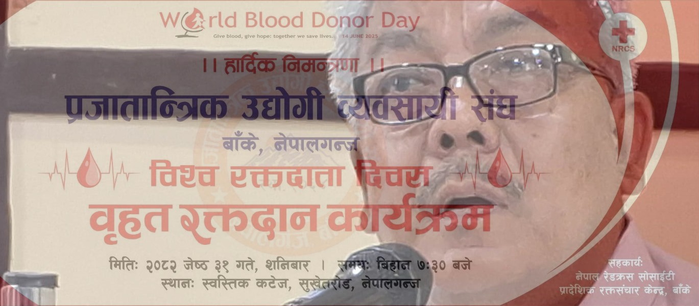 प्रजातान्त्रिक उद्योगी व्यवसायी संघ बाँके,नेपालगंजले विश्व रक्तदाता दिवसको उपलक्ष्यमा बृहत रक्तदान कार्यक्रम गर्ने भएको छ ।संघको सामाजिक उत्तरदायीत्व समेत समाजमा हुने बताउँदै संघ अध्यक्ष संजय थापाले बृहत रक्तदान कार्यक्रमको आयोजना गर्न लागेको जानकारी दिएका छन ।प्रजातान्त्रिक उद्योगी व्यवसायी संघ नेपालगंज उपमहानगरपालिका नगर समितिका अध्यक्ष शिव प्रसाद दाहालका अनुसार जेष्ठ ३१ गते शनिबारका दिन विहान ७ः३० बजेबाट रक्तदानको कार्याक्रम सुरु हुने जानकारी दिएका छन ।सुर्खेतरोड स्थित स्वास्तिक कटेजमा रक्तदान कार्याक्रम गरीने भएको छ जसको सहकार्य नेपाल रेडक्रस सोसाइटी प्रादेशिक रक्तसंचार केन्द्र,बाँकेको रहेको छ ।आयोजना गर्न लागिएको वृहत रक्तदान कार्यक्रममा सम्पुर्णलाई सहभागीताका लागि समेत अनुरोध संघले गरेको छ ।