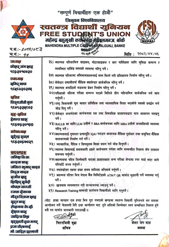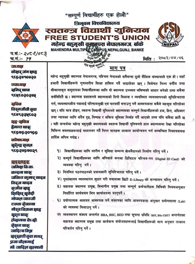 स्वतन्त्र विद्यार्थी युनियन महेन्द्र बहुमुखी क्याम्पस नेपालगंज बाँकेले क्याम्पस प्रशासनलाई ५१ बुदे विभिन्न माग राख्दै पत्र बुझाएको छ र स्वतन्त्र विद्यार्थी युनियन महेन्द्र बहुमुखी क्याम्पस नेपालगंजका अध्यक्ष केशरजंह शाहीको नेतृत्वमा गएको टोलीले महेन्द्र बहुमुखी क्याम्पस नेपालगंजका क्याम्पस प्रमुख डाक्टर लालमणी आचार्यलाई पत्र बुझाएका स्वतन्त्र विद्यार्थी युनियनका सचिव चिरन्जीवी बुढाले जानकारी दिएका छन ।क्याम्पस प्रशासनले क्याम्पसको दिगो विकास र व्यस्थित व्यवस्थापनको सुनिश्चिता गर्न ,व्यवस्थापकीय पक्षलाई परिणमुखी एवं पारदर्शी बनाउने पर्ने आवश्यकता महसुस गरीएको हुदाँ माग पत्र सहित ध्यानाकर्षण गराएको स्ववियु अध्यक्ष शाहीले बताए । यसैगरी माग पत्रको बारेमा स्पष्ट पार्दै अध्यक्ष शाहीले भने,हामीेले विद्यार्थीका लागि अवाश्यक खेलमैदान,नियमित पठनपाठन,सम्पुर्ण विद्यार्थीहरुका लागि अनिवार्य रुपमा डिजिटल परिचयको व्यवस्था,नियमित पठनपाठन,पुस्तकालय व्यवस्थापन,सहायक क्याम्पस प्रमुख ,विभागीय प्रमुख तथा सम्पुर्ण कर्मचारीहरु त्रिवि नियम अनुसार निर्धारित कार्यसमय भित्र कार्यालयमा बस्नुपर्ने,विभिन्न विभागका प्रयोगशालाको व्यवस्थापन,विभिन्न विभागका संयोजकहरुको अवश्यक व्यवस्थापन,कक्षाकोठाको व्यवस्थापन,क्याम्पसमा सिसिटिभी,कानुन संकाय अन्तगर्त विएएलएलविको संयोजक नियुक्ति लगायतका विषयमा मागहरु राखेका छौ ।’